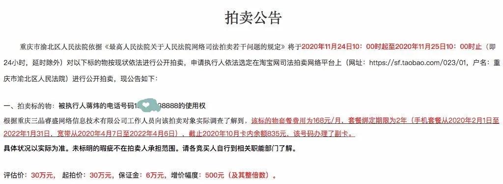 新闻一:重庆市渝北区法院成功拍卖6个8手机靓号