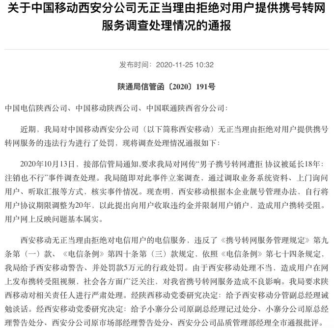 西安移动根据本企业靓号管理办法,自行将用户协议期限调整为20年,以此提出向用户收取违约金并限制用户销户,造成用户携号转网受阻。工信部信管局通知,要求陕西省通信管理局对网传“男子携号转网遭拒 协议被延长18年:注销也不行”事件调查处理。用户网上反映问题基本属实。处理结果: